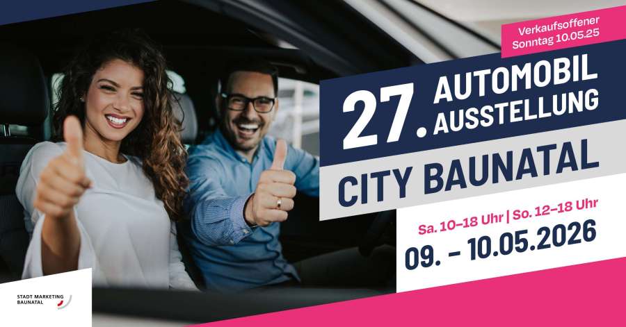 Baunatal | Stadtmarketing – Im Mai dreht sich in Baunatals Innenstadt alles um Mobilität und Familienfeeling! Die 27. Baunataler Automobilausstellung findet am 9. und 10. Mai 2026 statt – mit 23 Automarken von 10 regionalen Autohäusern, 2 Wohnmobilanbietern und 4 Zubehör- Anbietern.